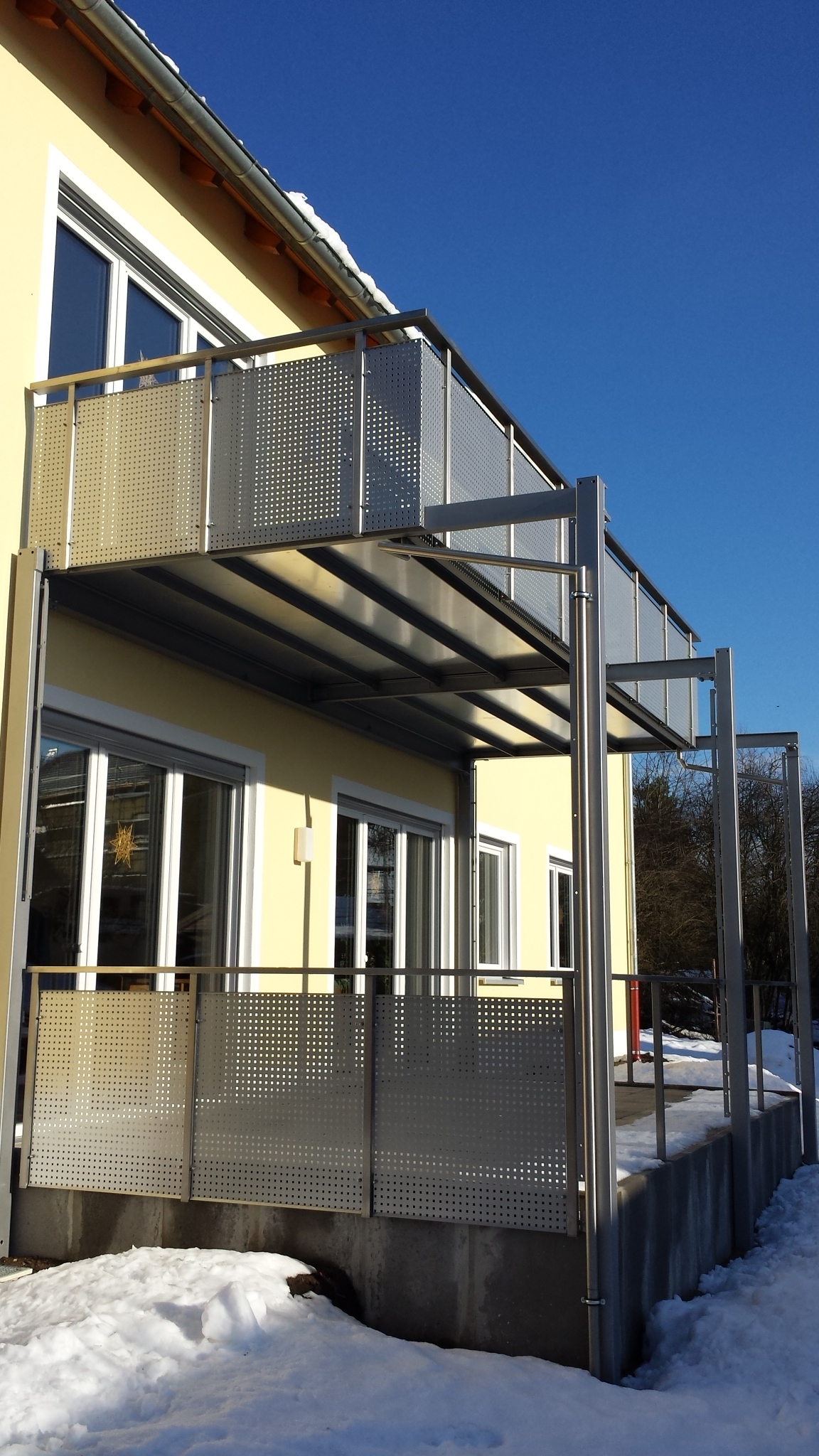 Balkon 203-4 Gallerie: Balkone Beschreibung: Balkon mit Aluwanne, wasserdicht Abstützung nach aussen verlegt , Edelstahlgeländer mit pulverbeschichteten Lochblech