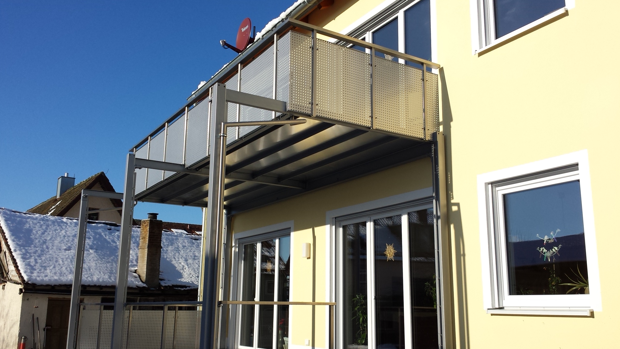 Balkon 203-1 Gallerie: Balkone Beschreibung: Balkon mit Aluwanne, wasserdicht Abstützung nach aussen verlegt , Edelstahlgeländer mit pulverbeschichteten Lochblech