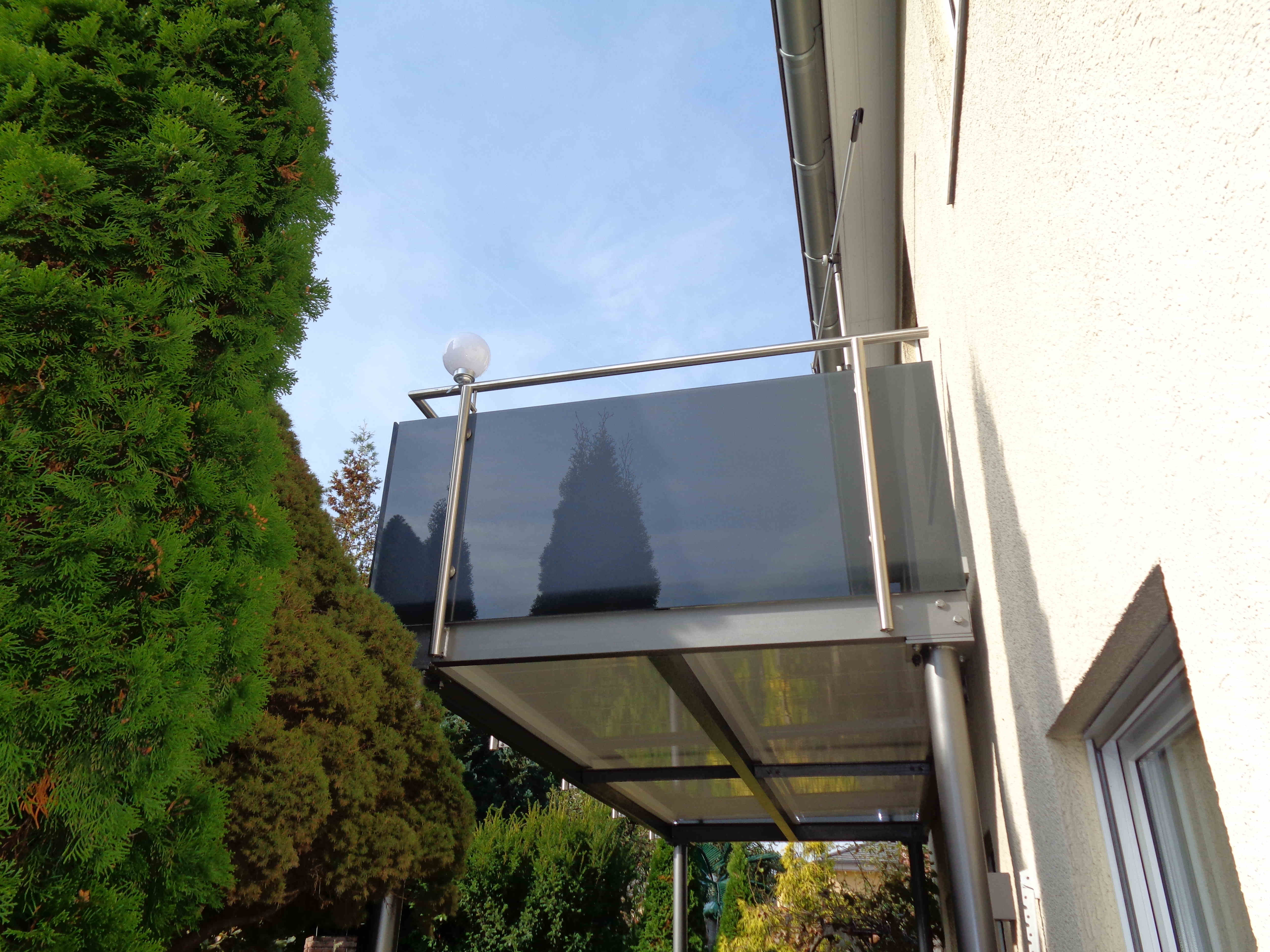 mit Edelstahlgeländer und undurchsichtigen Rauchglas Ein Unterstand ist ein überdachter offener Platz als Schutz vor der Witterung.