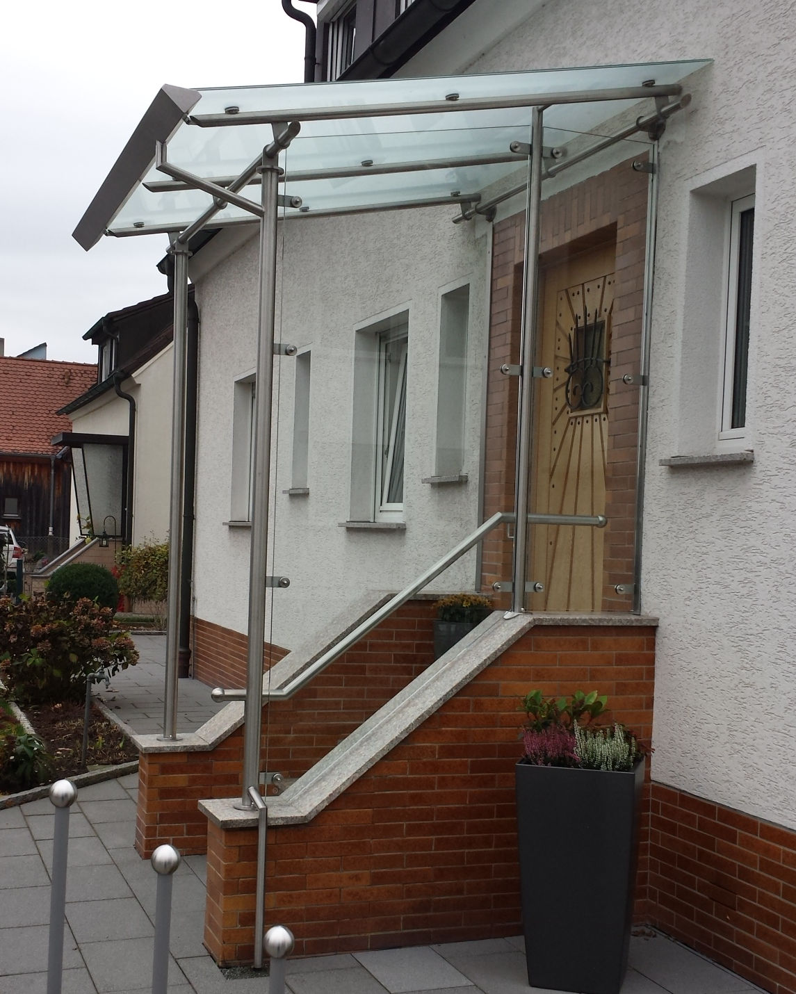 Vordach 213 Gallerie: Vordächer Beschreibung: Edelstahl-Konstruktion mit Sicherheitsglas-Eindeckung mit Windschutzseitenteil - Entwässerung in der Stütze