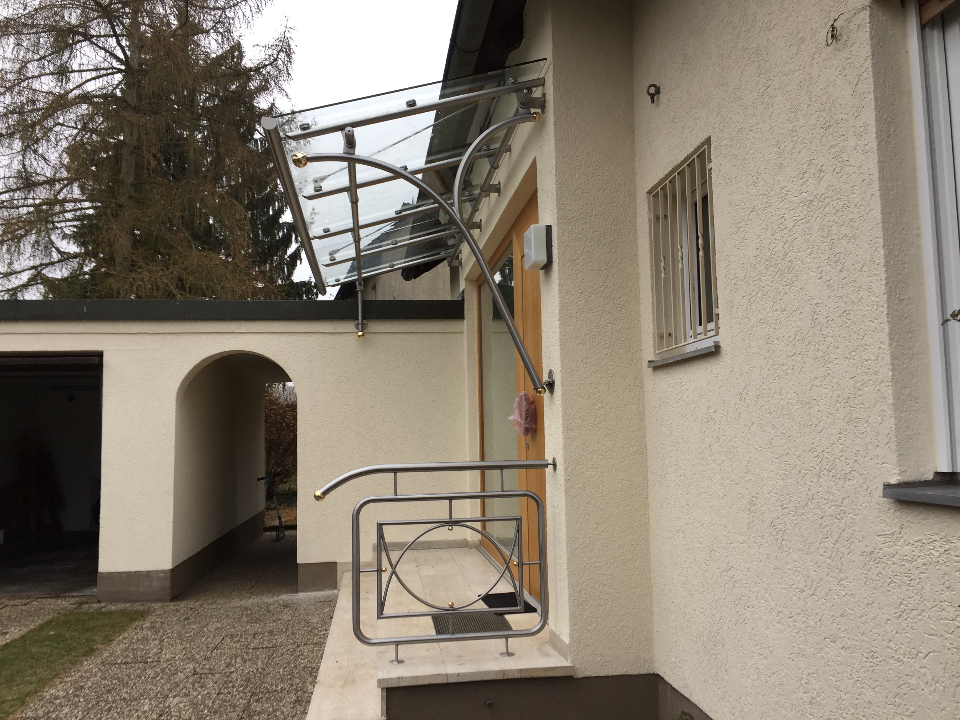 Vordach 228 Gallerie: Vordächer Beschreibung: Jugendstil - Design - Vordach mit TVG - Sicherheitsglasscheibe - über Punkthalterungen verschraubt, mit Regenrinne - Verzierungen durch Messingkugeln