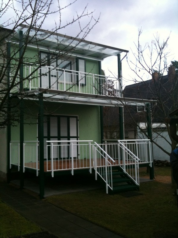 Balkon / Geländer 219-2 Gallerie: Aussen Geländer Beschreibung: zweistöckiger Stahbalkon , mit pulverbeschichteten Stahlgeländer , Glasdach