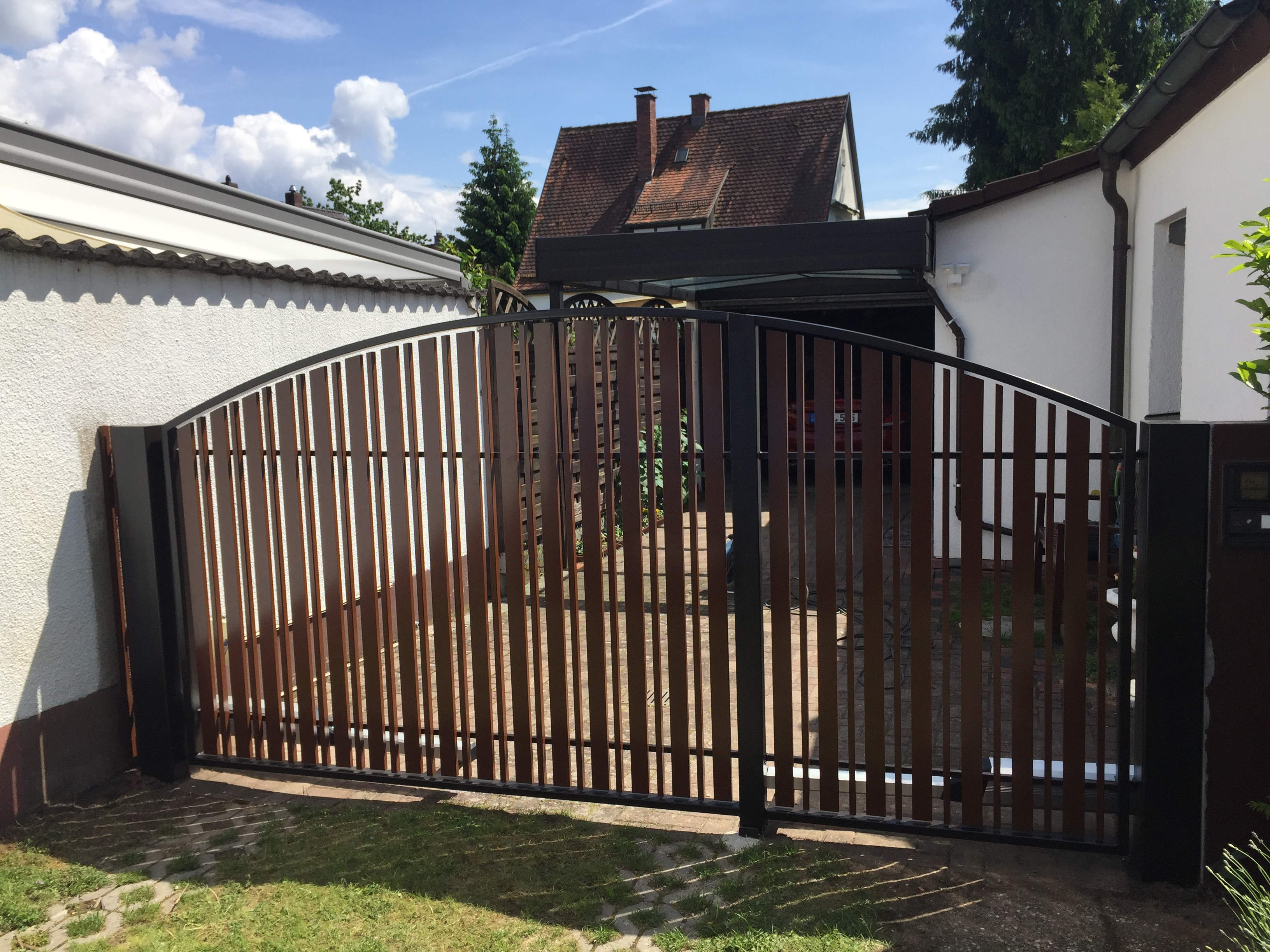 Einfahrtstor 2403043 Gallerie: Tore Beschreibung: Einfahrtstor mit selbstschießenden Türflügel - motorisch betrieben Stahl - Alu - Kombination
