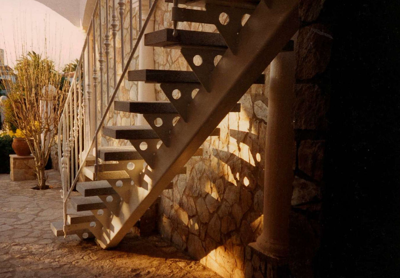 Treppengeländer 26-2 Gallerie: Aussen Treppen Beschreibung: Mittelholmtreppe mit Zierkonsolen - massiver Steinbelag - Schmiedeeisengeländer Stahl - feuerverzinkt lackiert