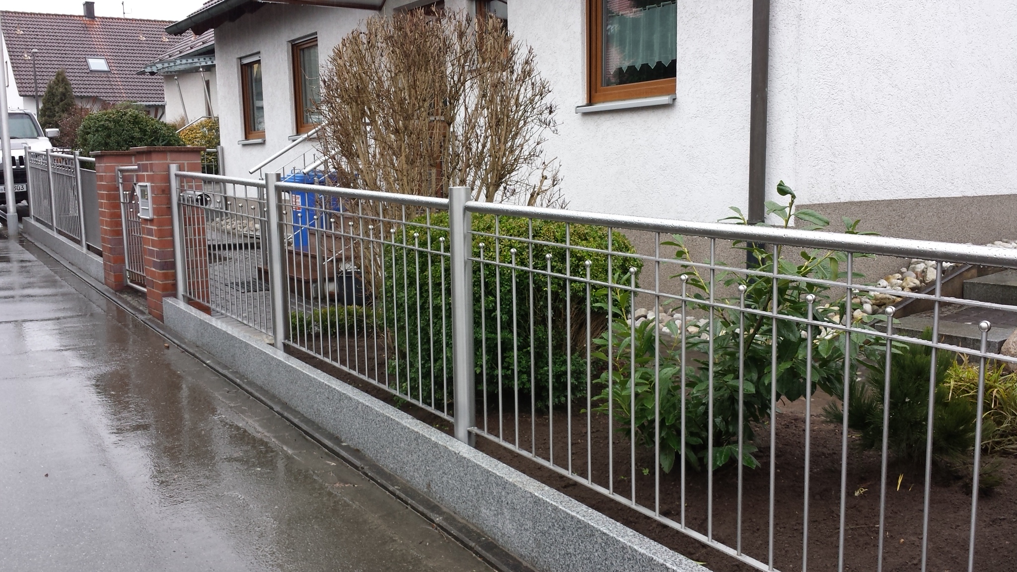 Zaun 219-2 Gallerie: Zäune Beschreibung: Edelstahl - Zaun hinter Rabattensteinen mit Kugelabdeckungen mit Lochblechfeld als Sichtschutz für den Mülleimer Platz